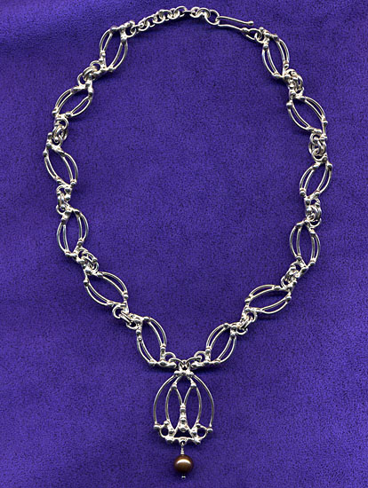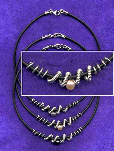 Pearl Twist choker Parting with tradition, this intriguing choker features both classic and modern elements. Spiraling sterling silver twists envelope a 3mm black rubber cord. A single freshwater pearl is the perfect focal point. Choose from a variety of pearl colors, including white, black and peach. 16" average length with lobster claw clasp. Custom lengths available. Please inquire about price |