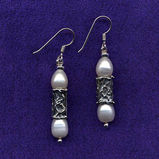 White double pearl earrings White pearls joined by a textured 4-sided tube of antiqued silver. Please inquire about price |