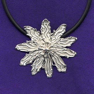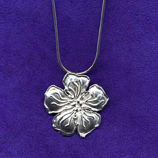 Blossom pendant or pin Better than a corsage, this lovely blossom can be worn as either a pendant or a pin and is guaranteed to never wilt! 1 3/8" x 1 3/8" on a 20" sterling silver snake chain. Please inquire about price |