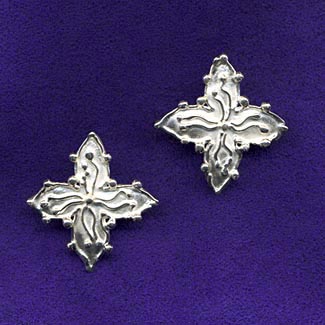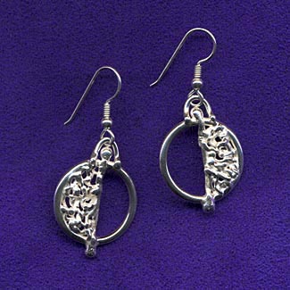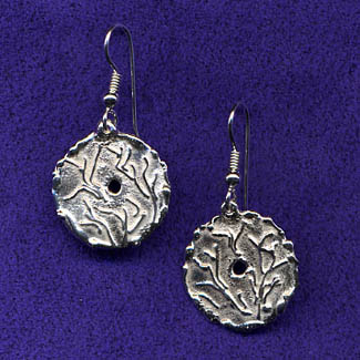 Tendril earrings Delicate tendrils reach upward across a frosted disc edged with frozen waves of sterling silver. 3/4" diameter Please inquire about price |
