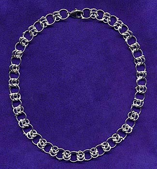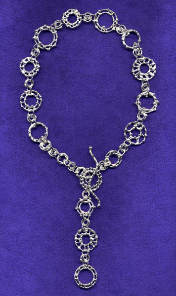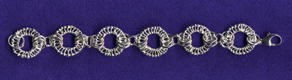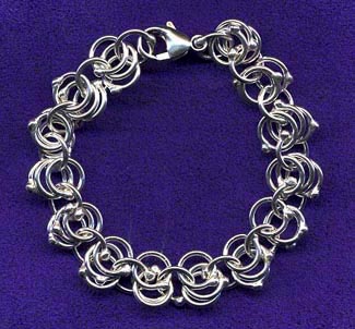 Triple-Ring Bracelet Handmade sterling silver rings link arms to form a triple chain of dazzling light. Pair with the Summer Solstice necklace for extra sparkle. 7 1/2" average length with silver lobster claw clasp. Custom lengths available. Please inquire about price