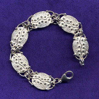 Follow-the-dots bracelet A wavy line follows the dots on this textured sterling silver bracelet. When you connect them, it encirles your wrist with what is sure to become your favorite bracelet. 3/4" x 7 1/2". Please inquire about price |